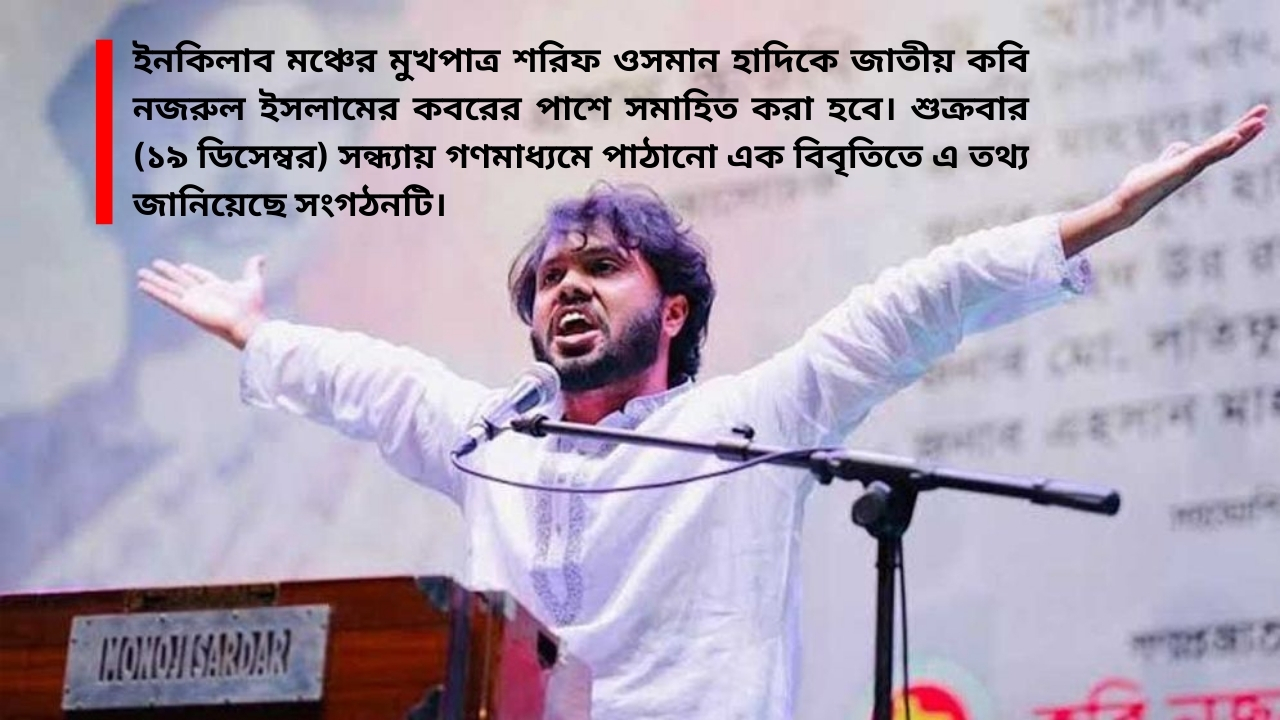 ইনকিলাব মঞ্চের মুখপাত্র শরিফ ওসমান হাদিকে জাতীয় কবি নজরুল ইসলামের কবরের পাশে সমাহিত করা হবে। শুক্রবার (১৯ ডিসেম্বর) সন্ধ্যায় গণমাধ্যমে পাঠানো এক বিবৃতিতে এ তথ্য জানিয়েছে সংগঠনটি।